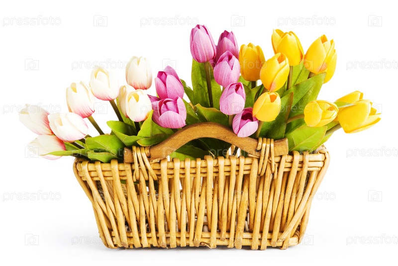 Букет тюльпанов в плетеной корзинке на белом фоне