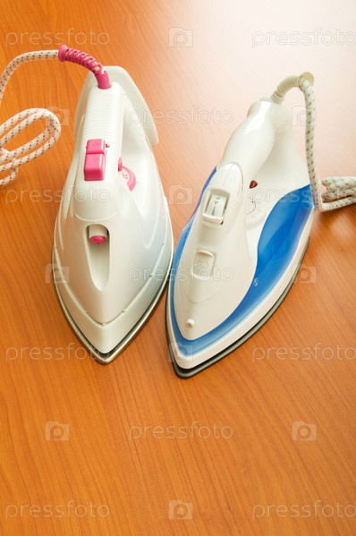 Два современных утюга на деревянной поверхности