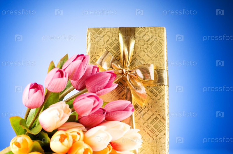 Букет из разноцветных тюльпанов на фоне подарочной коробки