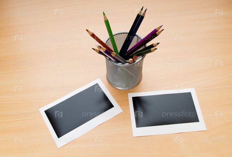 Цветные карандаши и пустые фоторамки на деревянном столе