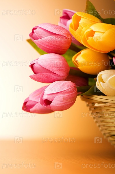 Разноцветные тюльпаны в плетеной корзине на желтом фоне