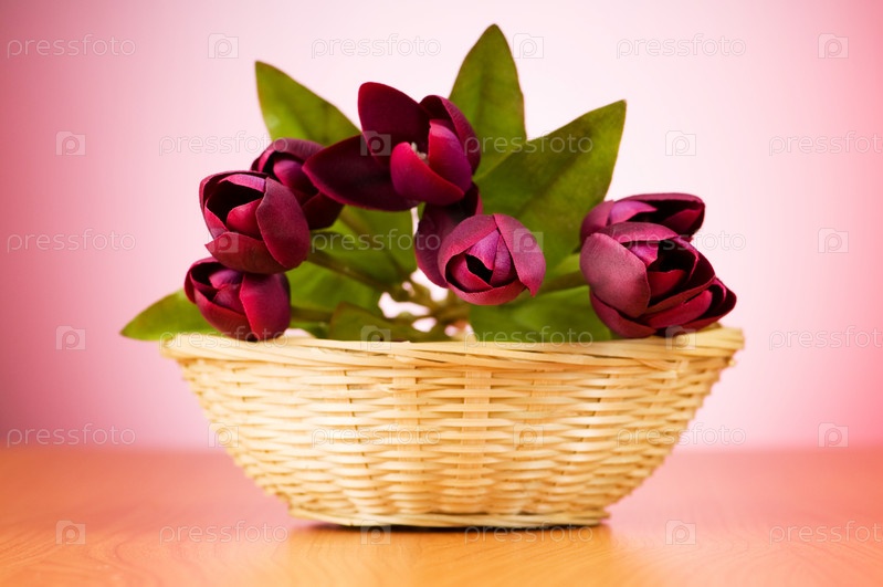 Фиолетовые тюльпаны в плетеной корзине на розовом фоне
