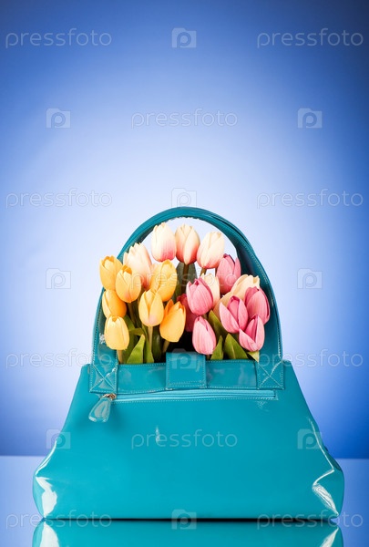 Голубая сумка полная разноцветных тюльпанов на синем фоне