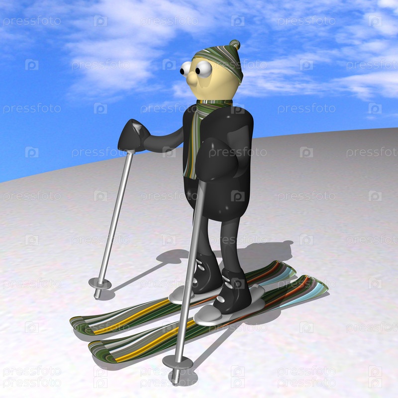Горнолыжник стоит на горных лыжах, в снегу, на фоне неба, 3d