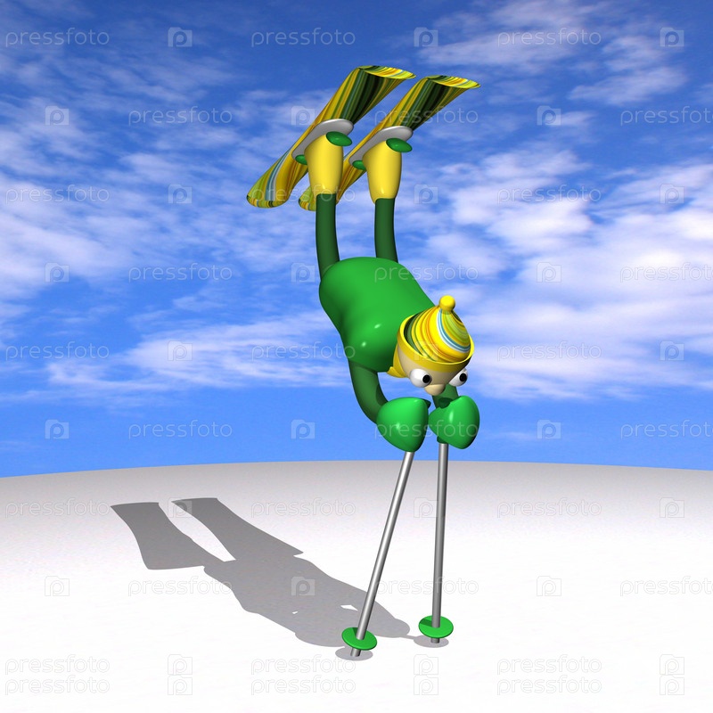 Человечек горнолыжник выполняет акробатические элементы фристайла на снегу на фоне неба
