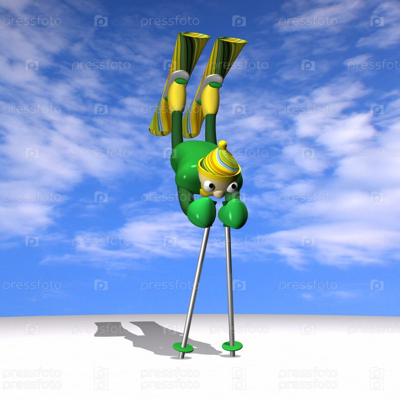 Человечек горнолыжник выполняет акробатические элементы фристайла на снегу на фоне неба
