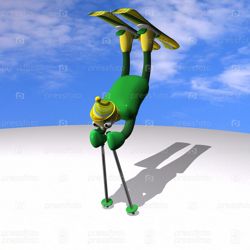 Человечек горнолыжник выполняет акробатические элементы фристайла на снегу на фоне неба