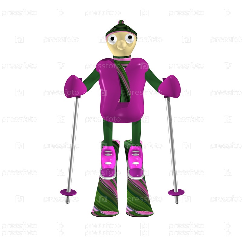 Горнолыжник стоит на горных лыжах, 3d, изолированный, белый фон
