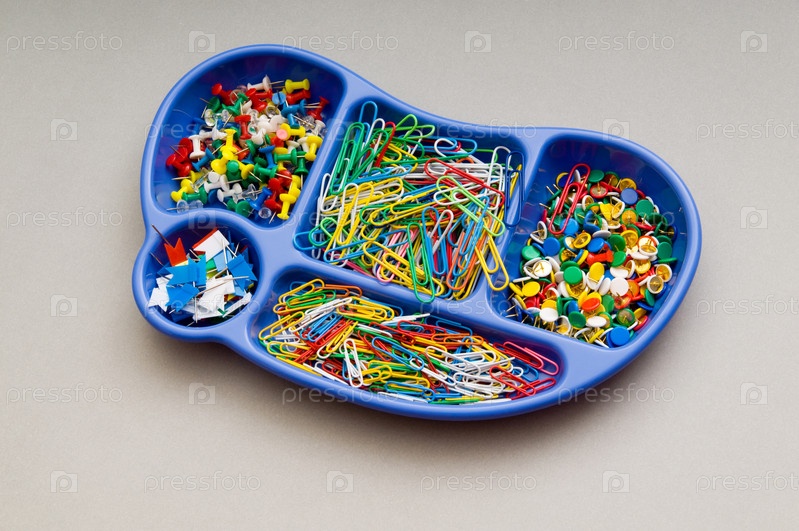 Кнопки, скрепки и зажимы в синем лотке