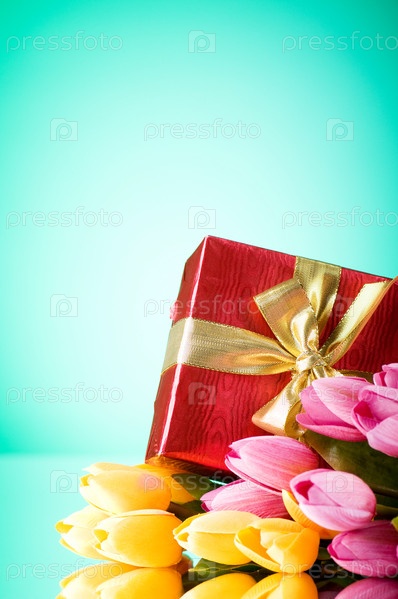 Подарочная коробка и букет тюльпанов