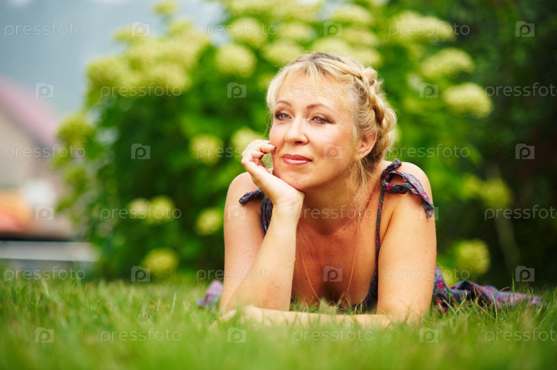 Женщина средних лет лежит на траве в солнечный день