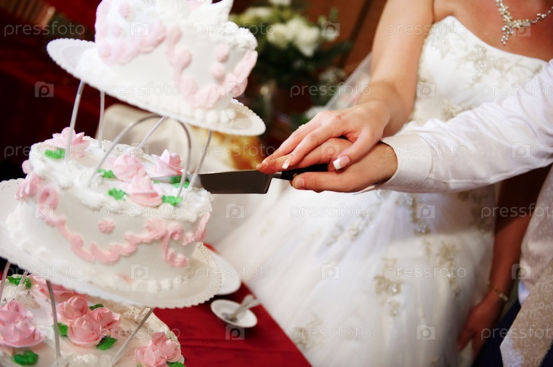 Молодожены режут свадебный торт