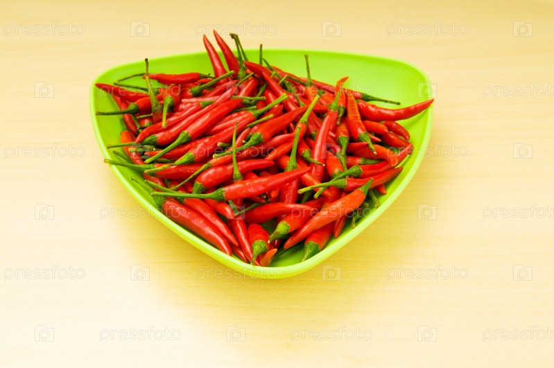 Жгучий перец на тарелке на деревянном столе
