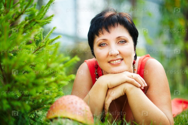 Женщина средних лет в красном сарафане лежит на зеленой траве