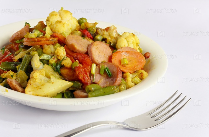 Тарелка с овощным рагу на белом фоне