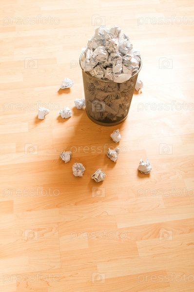 Переполненная мусорная корзина, стоящая на ламинате