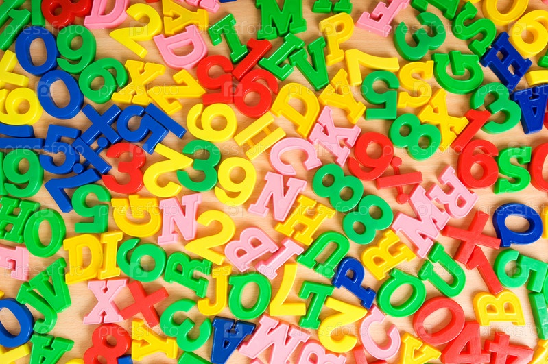 Множество разноцветных игрушечных цифр и букв