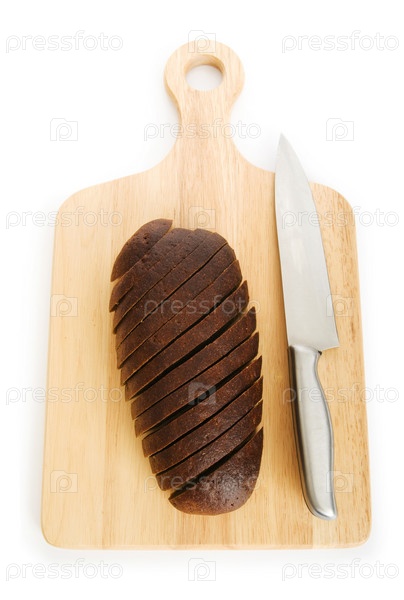 Порезанный хлебный батон и нож на разделочной доске, изолированной на белом фоне