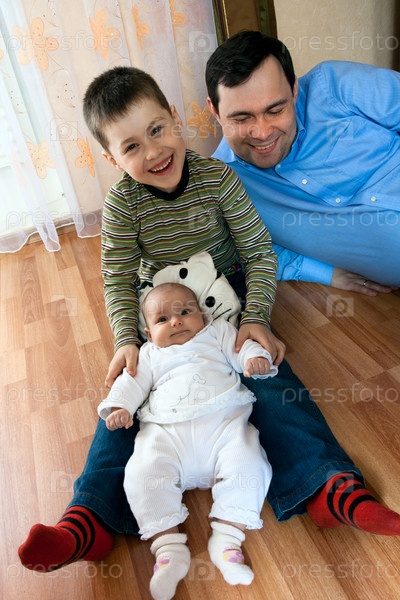 Счастливая семья: отец с сыном и младенцем играют на полу