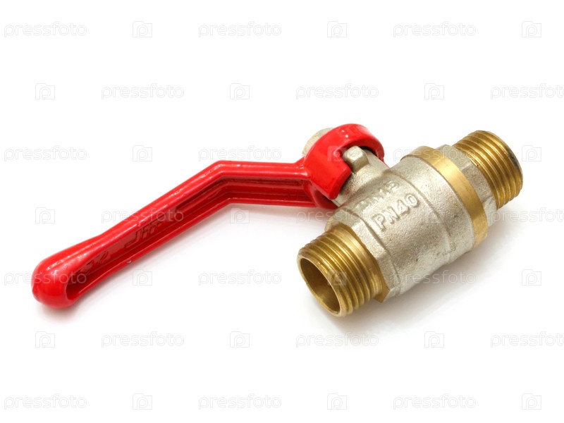 Трубопроводный кран из белого металла с красной ручкой на белом фоне