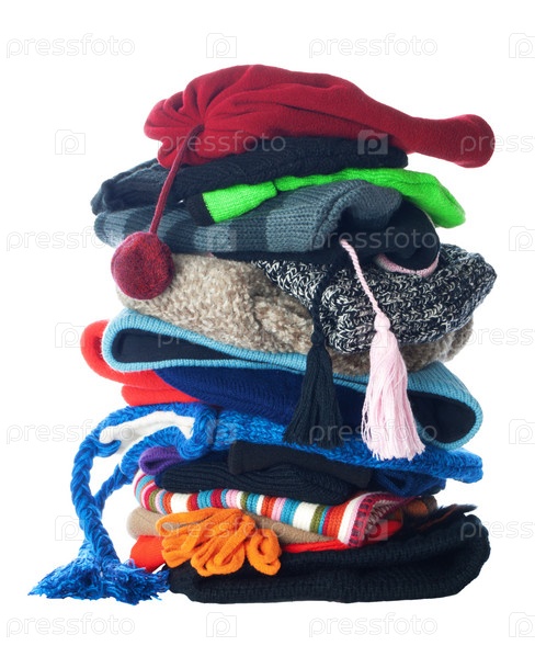 Стопка зимних вязаных шапок, изолированная на белом фоне