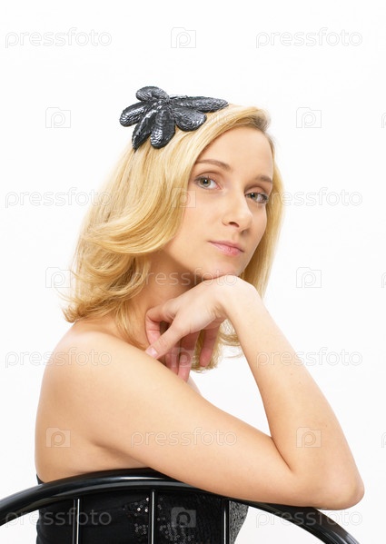 Молодая девушка в черном платье с бантом в волосах на белом фоне