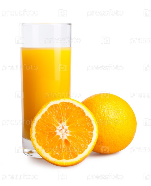 Стакан апельсинового сока и апельсины, изолированные на белом фоне