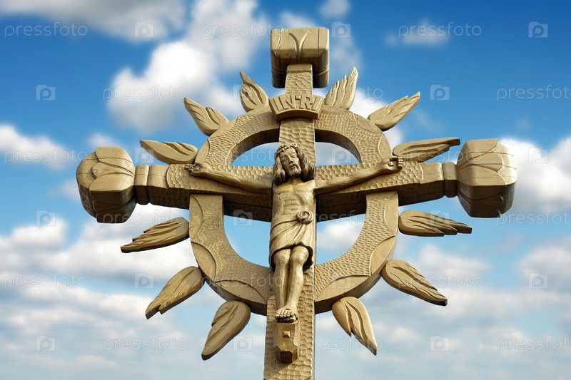 Литва. Крестовая гора. Деревянный крест с распятием Христа на фоне голубого неба