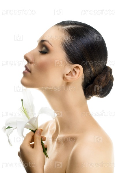 Портрет темноволосой девушки с лилией в руках, изолировано на белом фоне