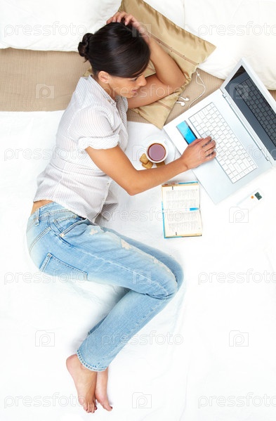Молодая темноволосая девушка работает на ноутбуке, лежа в постели