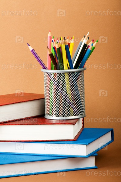 Стопка книг и цветные карандаши