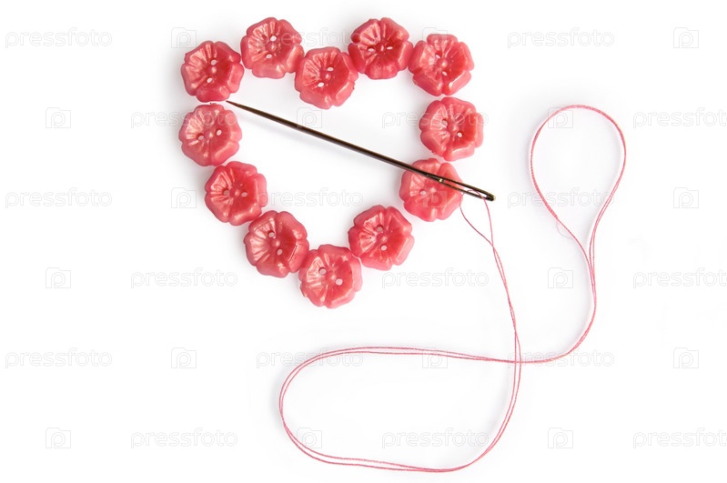 Сердце из розовых пуговиц с иголкой и розовой ниткой на белом фоне