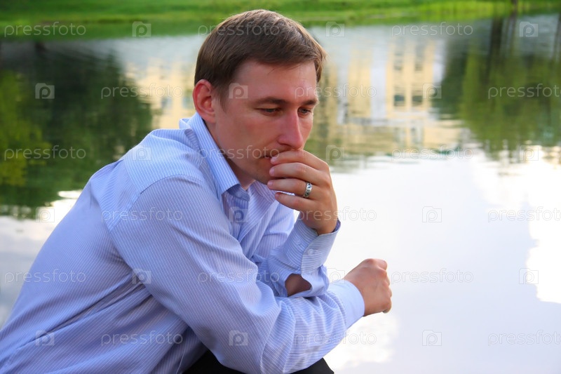 Мужчина размышляет на берегу водоема