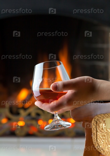 Бокал коньяка в руке на фоне горящего камина