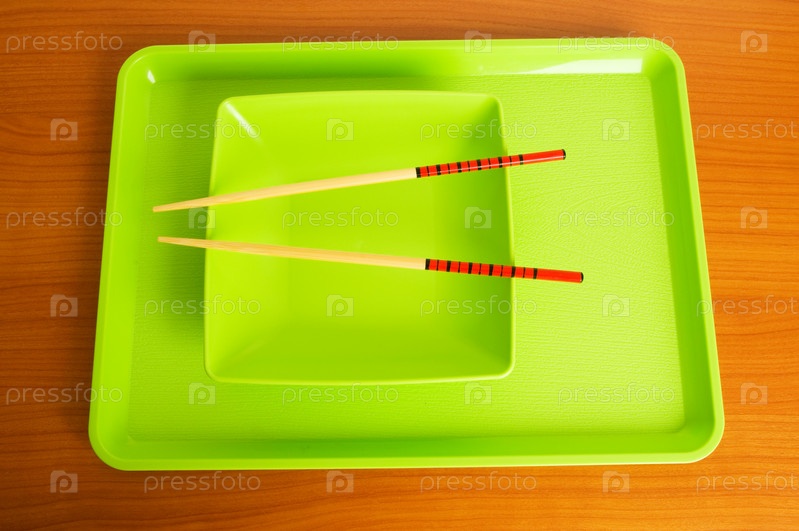 Квадратная тарелка и палочки для суши на зеленом лотке