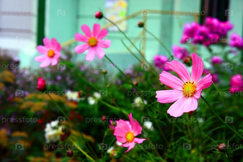 Розовые цветы на фоне зелени