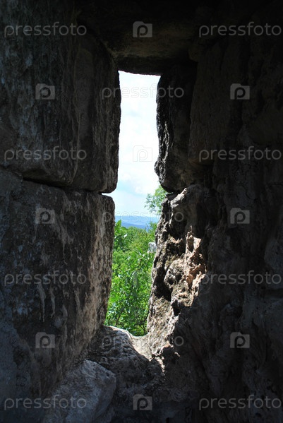 Красивый пейзаж сквозь проем в каменной стене