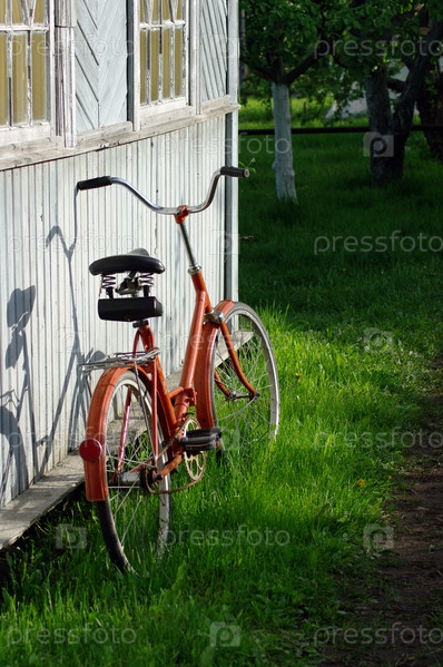 Старый красный велосипед на траве возле стены деревянного дома