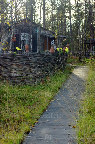 Дом в лесу, плетень, деревянные мостки