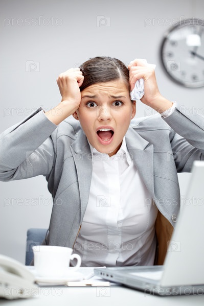Молодая бизнес-леди сидит в отчаянии за рабочим столом с ноутбуком