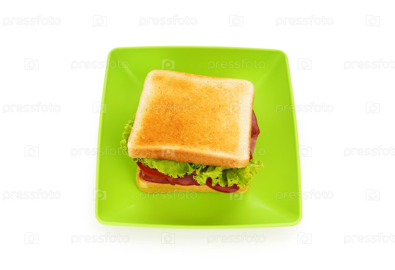 Вкусный бутерброд на тарелке на белом фоне