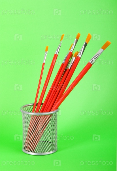 Набор красных художественных кистей в стакане на зеленом фоне
