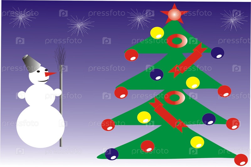 Новогодняя иллюстрация с наряженной елкой и снеговиком