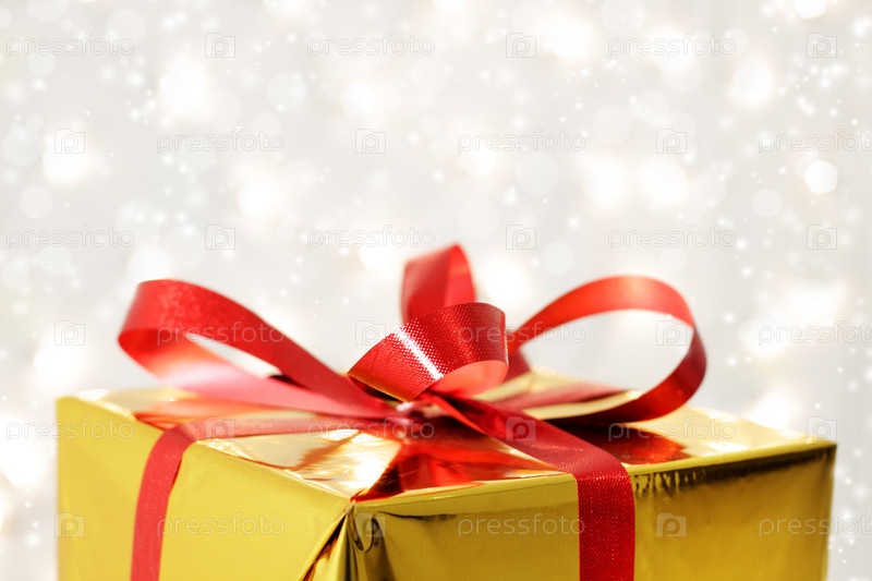 Подарок в золотой упаковке с красным бантом крупным планом