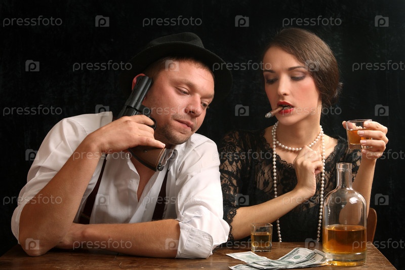 Мужчина с пистолетом в баре с молодой девушкой