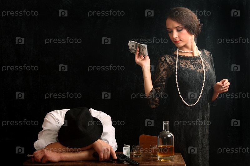 Мужчина с пистолетом в баре с молодой девушкой