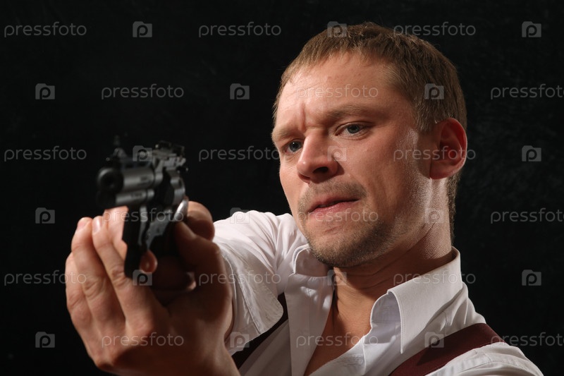 Мужчина с пистолетом в руках на черном фоне