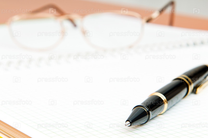 Шариковая ручка и очки на раскрытом блокноте