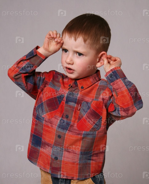 Мальчик в клетчатой рубашке держится за ухо