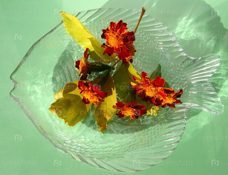 Оранжевые цветы в тарелке в форме рыбы
